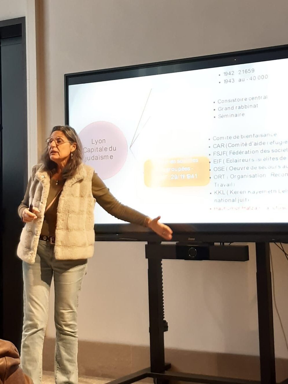 Outre ces visites, les participants ont pu assister à trois conférences assurées par les historien•ne•s Alexandre Bande1, Sylvie Altar2 (ci-contre) et Philippe Boukara3, aux thématiques couvrant l’histoire et la mémoire du génocide, avec un intérêt marqué pour l’histoire juive de Lyon.