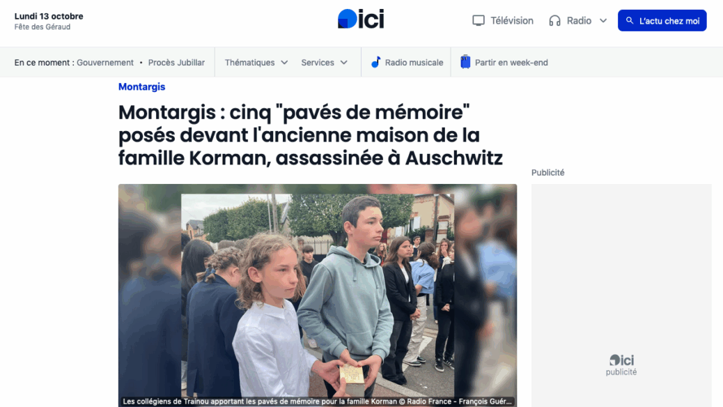 Aux côtés de Marie Pourriot, leur professeure, ces adolescents se sont ainsi penchés sur le destin tragique de la famille Korman. Et plus particulièrement des trois petites filles qui ont vécu dans cette maison de Montargis et qui ont été arrêtées par les nazis le 9 octobre 1942 – d’où le jour choisi pour la cérémonie, au cours de laquelle ils ont lu ce poème écrit en classe : « Elles s’appelaient Mireille, Jacqueline, Henriette / Trois petites filles, trois vies en miette / Dix ans, cinq ans, trois ans – c’est tout / C’est peu, mais c’étaient elles – et là, c’est nous / (….) Mireille, Jacqueline, Henriette / Trois souffles, trois étoiles discrètes / Que jamais nos voix ne les trahissent / Que l’école les dise, et que la mémoire les hisse« .