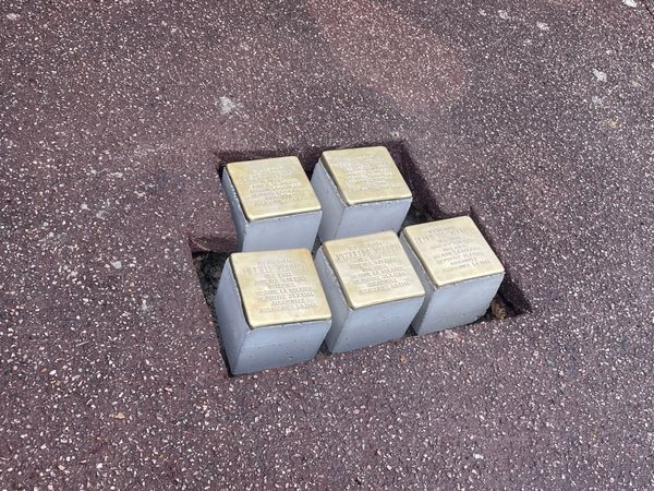 Les cinq pavés de mémoire, avant qu’ils ne soient scellés dans le trottoir