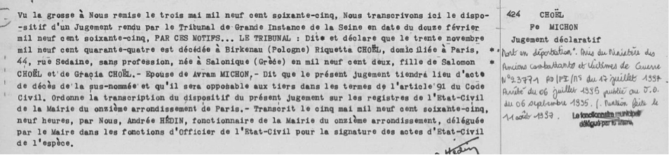 Le 12 février 1965, au terme de vingt ans de démarches administratives, un jugement déclaratif de décès de Riquetta est rendu par le Tribunal de grande instance de la Seine avec mention de transcription sur l’état civil, rendant officiel le décès de sa femme. Avram est enfin déclaré veuf et peut épouser Sophie Tzipkine.