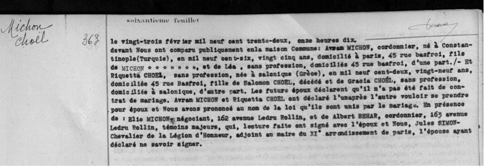 À partir du 1er juillet 1937[9], le couple Michon s’est installé 44 rue Sedaine, toujours dans le 11e arrondissement de Paris, un quartier d’implantation des immigrés peu fortunés d’origine judéo-espagnole, depuis la fin du XIXe siècle, où fleurissent les commerces, cafés et lieux de culte selon le rite séfarade. Les commerçants dans le textile y sont nombreux, grossistes et, comme Avram, « forains ». Il travaille seul, déclare-t-il en 1948.