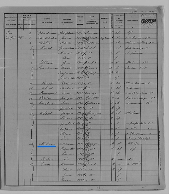 Extrait du recensement de 1936 de la ville de Paris 45, rue Basfroi, Paris XI.