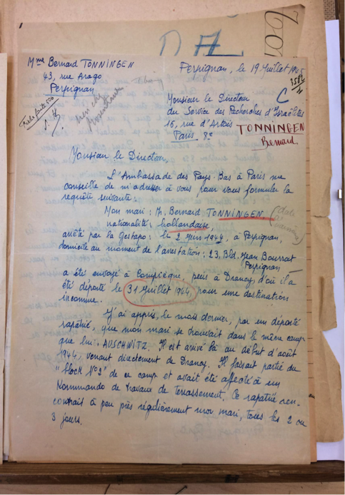 In een zeer ontroerende brief, geschreven op 19 juli 1945, richt de vrouw van Bernard Tonningen, die geen nieuws heeft van haar gedeporteerde echtgenoot, zich tot de Dienst voor Onderzoek naar Israëlieten om informatie te krijgen. We begrijpen dat ze heeft gesproken met Hugo Perez, een overlevende van Konvooi 77 die samen met haar man in Auschwitz was. Ze weet dus waar haar man naartoe is gedeporteerd, maar weet niet wat er met hem is gebeurd en hoopt dat hij terugkomt. We hebben geen andere documenten over haar gevonden.