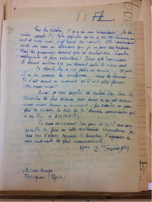 Dans une lettre très émouvante, rédigée le 19 juillet 1945, la femme de Bernard Tonningen, sans nouvelles de son mari déporté, s’adresse au Service des Recherches d’Israélites pour obtenir des informations. On comprend qu’elle s’est entretenu avec Hugo Perez, déporté rescapé du Convoi 77 qui fut à Auschwitz avec son mari. Elle sait donc où son mari a été déporté, mais ne connaît pas le sort de son époux et espère qu’il reviendra. Nous n’avons pas trouvé d’autres documents la concernant.