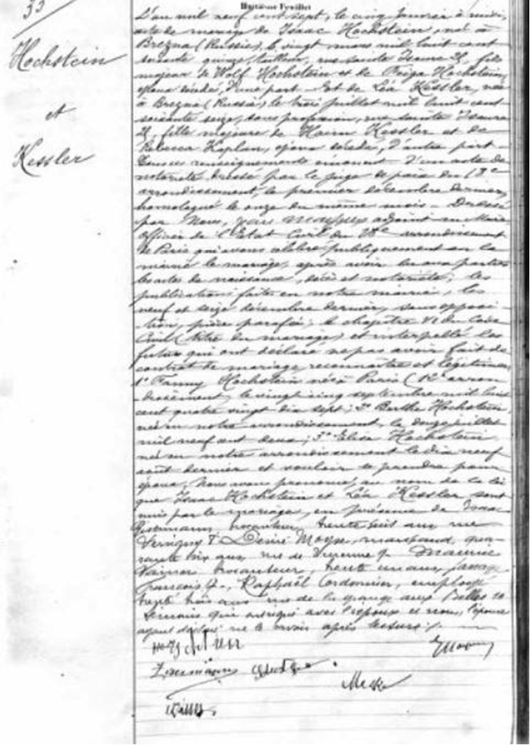 Acte de mariage de Lea Kessler et Isaac Hochstein © archives numérisées de Paris