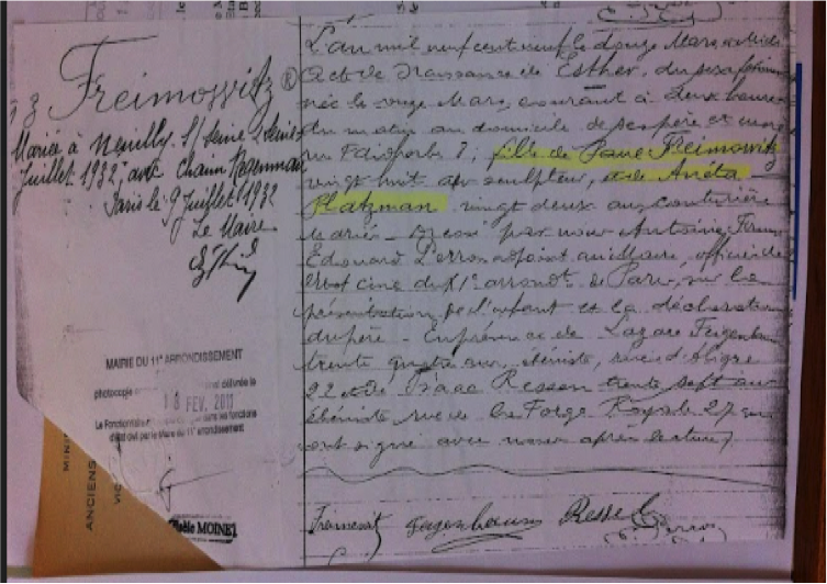 Acte de naissance d’Esther Freimowitz