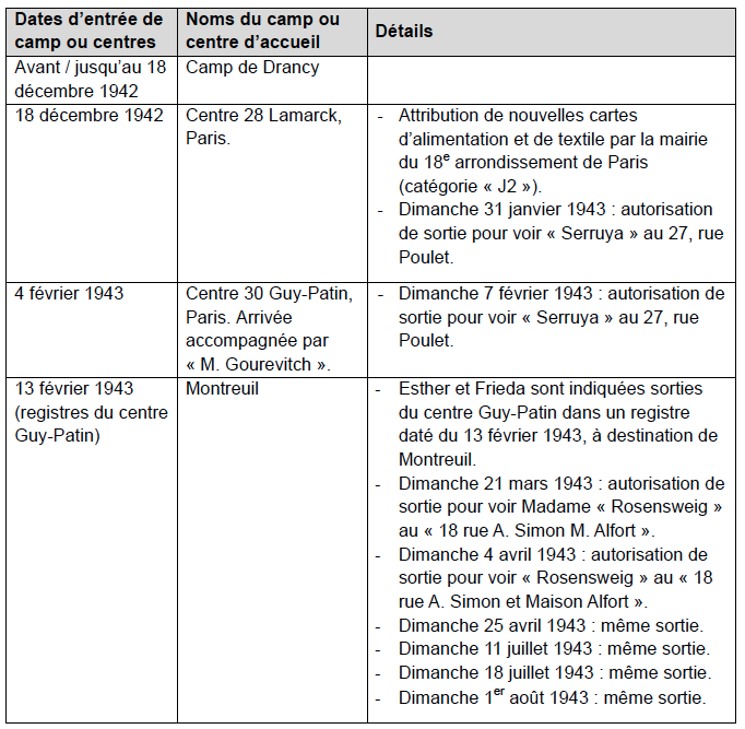 Tableau 1 – Frise chronologique récapitulative des déplacements d’Esther et de Frieda Wachsstock, entre 1942 et 1943.