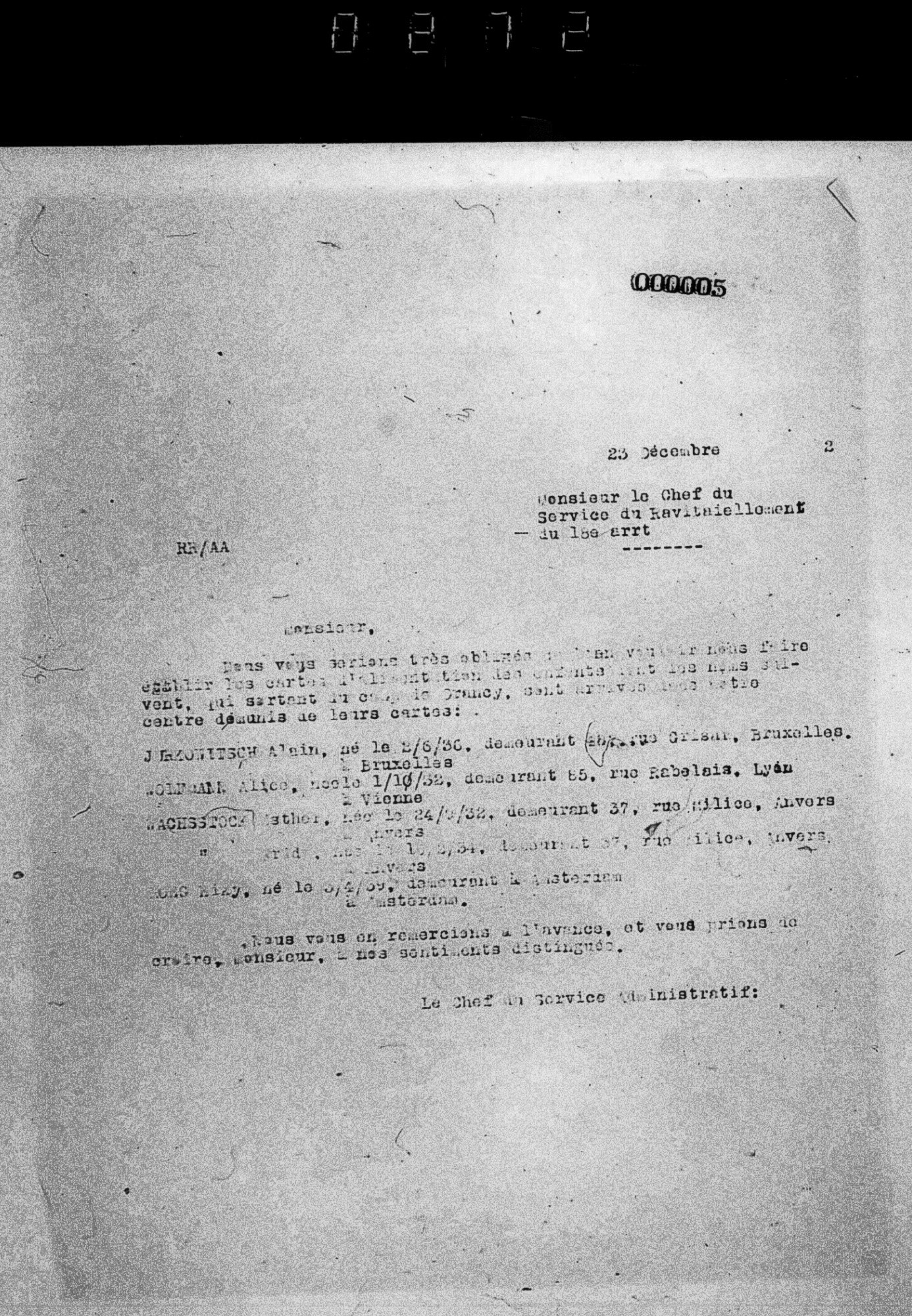 Avec Frieda, ma petite sœur, nous avons été placées dans un des centres de l’U.G.I.F., à Paris. Nous avons pu sortir du camp de Drancy, sans savoir trop comment. Nous n’avons ni carte d’alimentation ni carte de textile ; j’espère que nous en aurons bientôt.