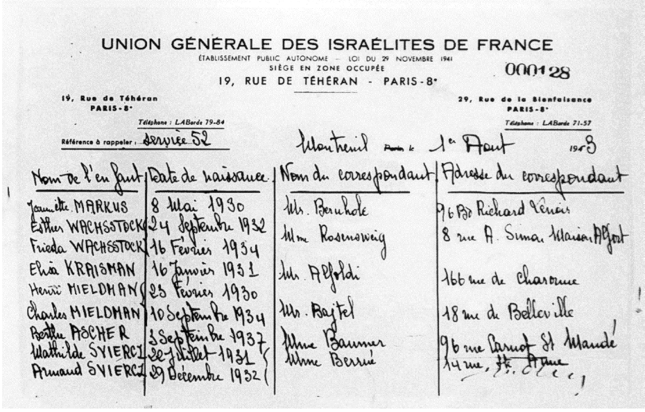 [Les « correspondants » de tous les enfants sont connus des Autorités allemandes, et les allées et venues des enfants très contrôlées, pour éviter les évasions, mises en œuvre parfois par des membres de la famille des enfants ou la résistance juive. Des évasions arrivèrent pourtant à la maison de Montreuil, début juillet. Les sœurs Wachsstock n’eurent pas cette chance].