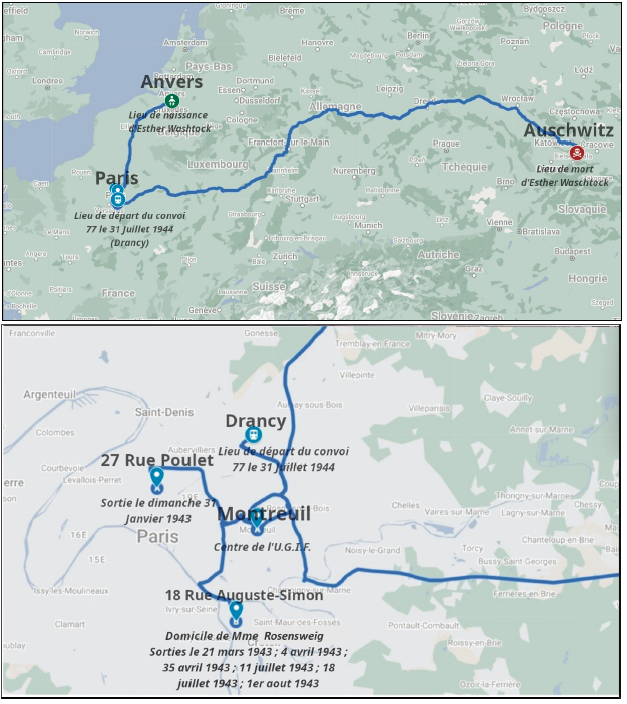Figure 5 – Deux cartes de synthèse réalisées par Théodore, Arnaud et Deniz sur le parcours d’Esther Wachsstock en Europe et à Paris (Googlemaps).