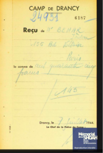 Le lendemain, à 15 heures 30, il est sorti de la préfecture pour être conduit au camp de Drancy, où il est interné. Il reçoit le matricule 24.931. Sa fiche de fouille à l’arrivée indique qu’il avait sur lui 145 francs.
