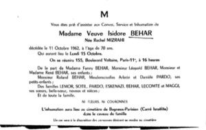 Rachel Mizrahi Behar meurt le 11 octobre 1962. Elle est inhumée dans le « carré israélite » du cimetière de Bagneux. Sa sœur Sol, veuve de Jacob dit Jacques Lemor, assiste à l’enterrement. René, son fils qui est inspecteur, ne lui survivra que de trois ans, il meurt à Paris le 9 juin 1965[12] et est inhumé également à Bagneux.