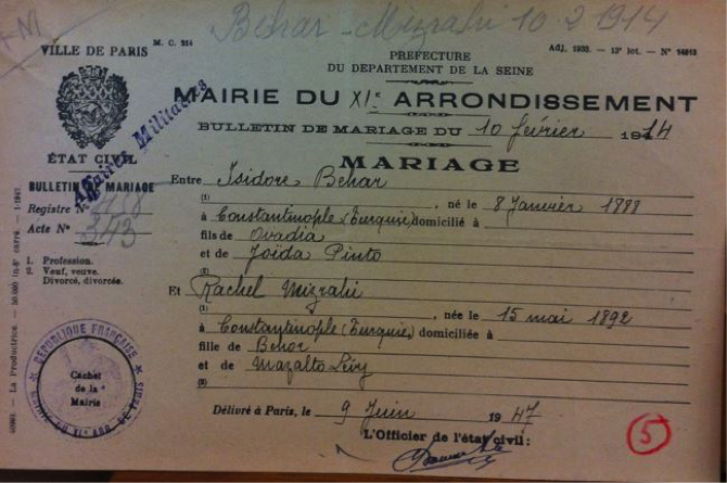 Isidore épouse Rachel Mizrahi, le 10 février 1914, née également à Constantinople, le 15 mai 1892. Elle est alors couturière. Au moment du mariage, Isidore est domicilié chez ses parents 53 rue de La Roquette, non loin de la place de la Bastille. Et Rachel vit à la même adresse. Ses parents sont mentionnés sans précision, sinon qu’ils sont nommés grâce à un acte de notoriété.