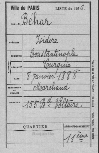 Les Béhar sont nombreux à Paris, notamment dans le quartier où vit Isidore. Sans doute certains sont-ils de proches ou lointains parents d’Isidore.