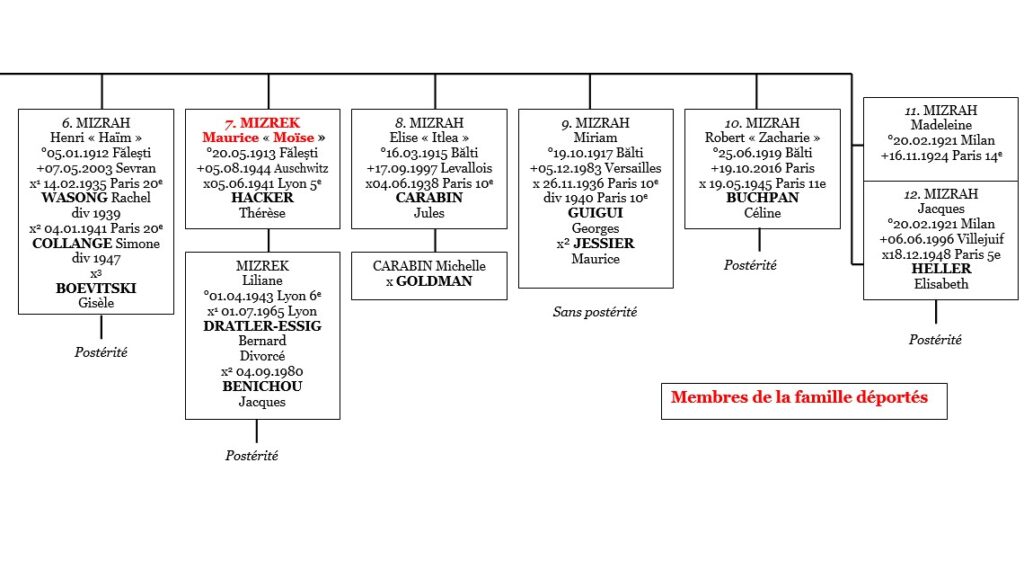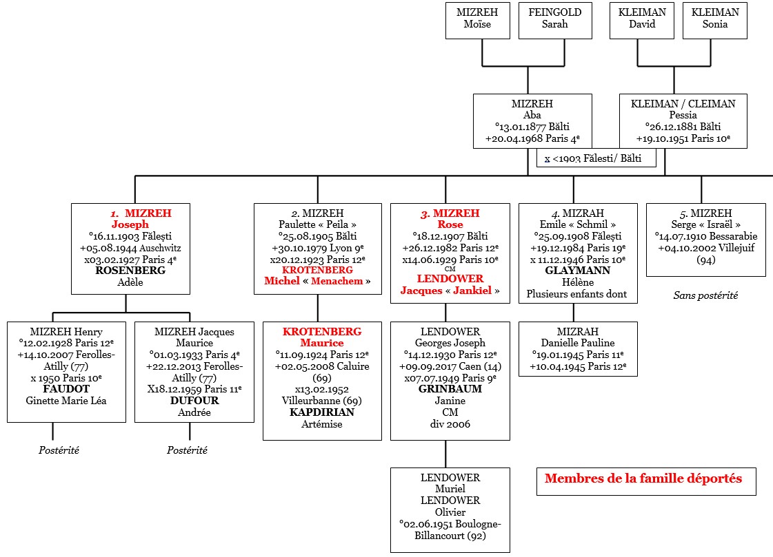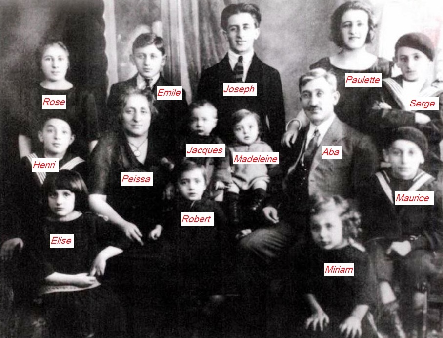 Aba épousa, sans doute à Bălți, Peissa[5] Kleiman[6], née à Bălți le 26 décembre 1881, fille de « David et de Sonia Cleiman[7] ». Entre 1903 et 1919, Aba et Peissa eurent sans discontinuité dix enfants en Moldavie : Joseph (1903), Peila/Paulette (1905), Rose (1907), Emile/Schmil (1908), Serge/Israël (1910), Henri/Haïm (1912), Maurice/Moïse (1913), Elise/Itlea (1915), Miriam (1917), et Robert/Zacharie (1919). Deux jumeaux devaient en 1921 agrandir la fratrie : Madeleine et Jacques, mais ils naquirent à Milan. Les aléas orthographiques donnent au patronyme trois formes différentes : Mizreh pour quatre d’entre eux, Mizrek pour Maurice, et Mizrah pour sept enfants, dont les cinq derniers.
