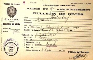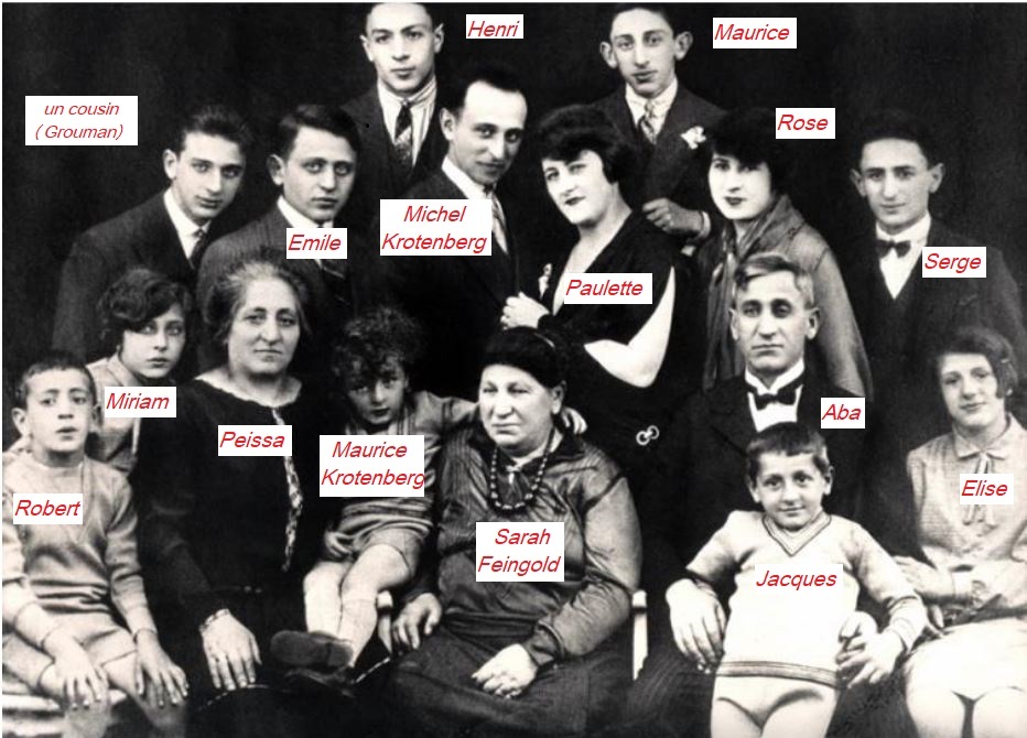 [4] Son identité est changeante selon les actes : dénommée « Sarah Feingold » sur l’acte de décès de son fils Aba, « Sarah Tainsof » sur l’acte de mariage de Michel Krotenberg et de Peila Mizreh en 1923 à Paris 12e, où elle est témoin et indiquée vivre 3, rue Maître Albert (Paris 5e) ; elle devient « Sarah Wansoff » sur le dossier d’aryanisation de l’atelier de son fils Aba. Elle était encore vivante en 1928 puisqu’elle figure sur la photo de famille. Si nous sommes presque certains qu’elle mourut à Paris, la volatilité de son identité rend la recherche ardue, malgré plusieurs tentatives sous différents noms dans les tables décennales.
