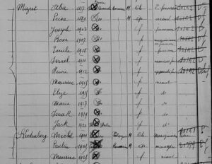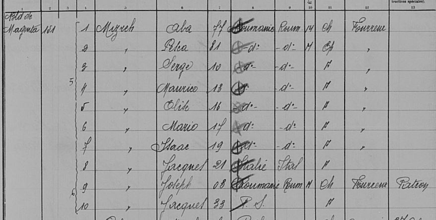 [10] Etonnante valse des prénoms dans ce recensement où la famille apparaît sous le nom de « Mizret » : Peila devient Paulin, Serge est déclaré sous le nom d’Israël, Miriam est Marie, Robert est Isaac, et Jacques devient « Jack » !