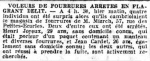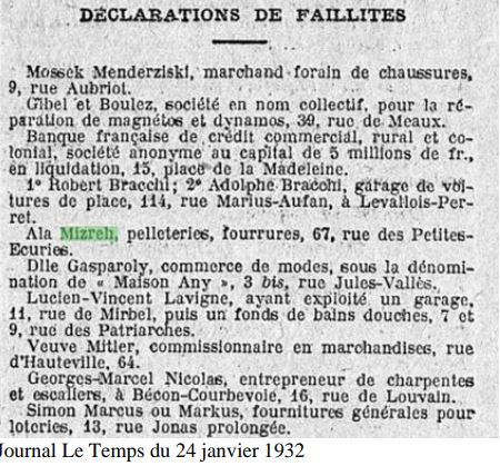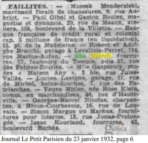 A partir de 1929[11] (ils apparaissent au recensement de 1931[12]), la famille – ainsi que les Krotenberg – habitent le 17, rue du Faubourg du Temple (10e) où Aba a ouvert un atelier de fourrures dans lequel travaille toute la famille. Il en possède également un autre à proximité au 57, rue des Petites Ecuries (10e). Pourtant, il semble que les affaires ne marchent pas vraiment : on apprend par une dépêche de l’Action française du 13 juillet 1931 que son atelier des Petites Ecuries a été cambriolé. En janvier 1932, deux entrefilets du Petit Parisien et du Temps indiquent la faillite des deux ateliers !