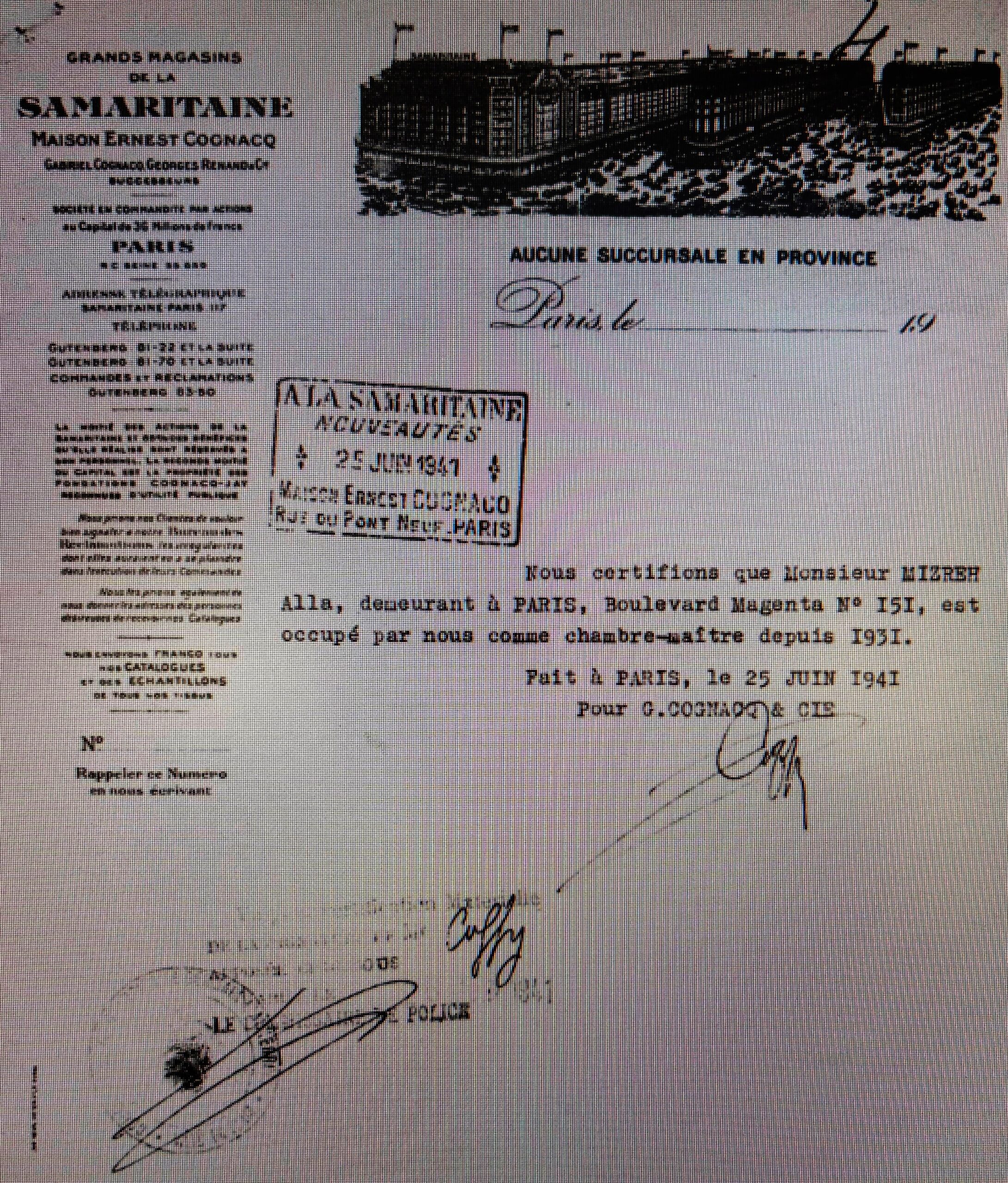 Certificat de travail de la Samaritaine – dossier d’aryanisation du 151, Bd Magenta