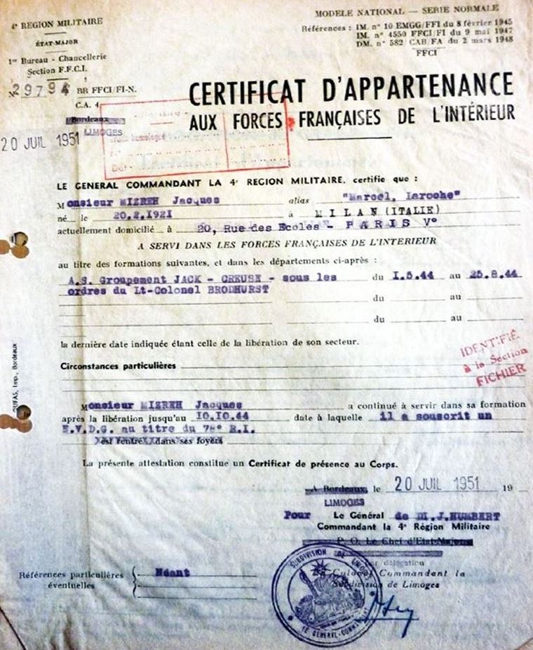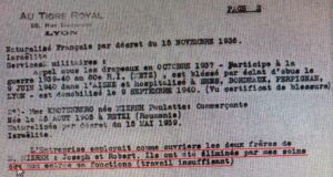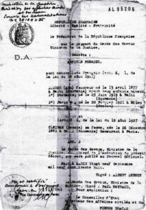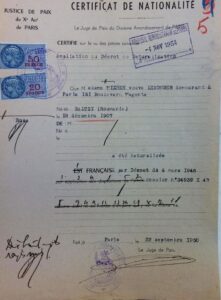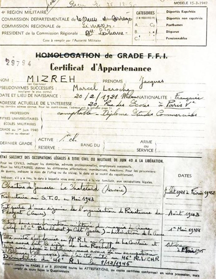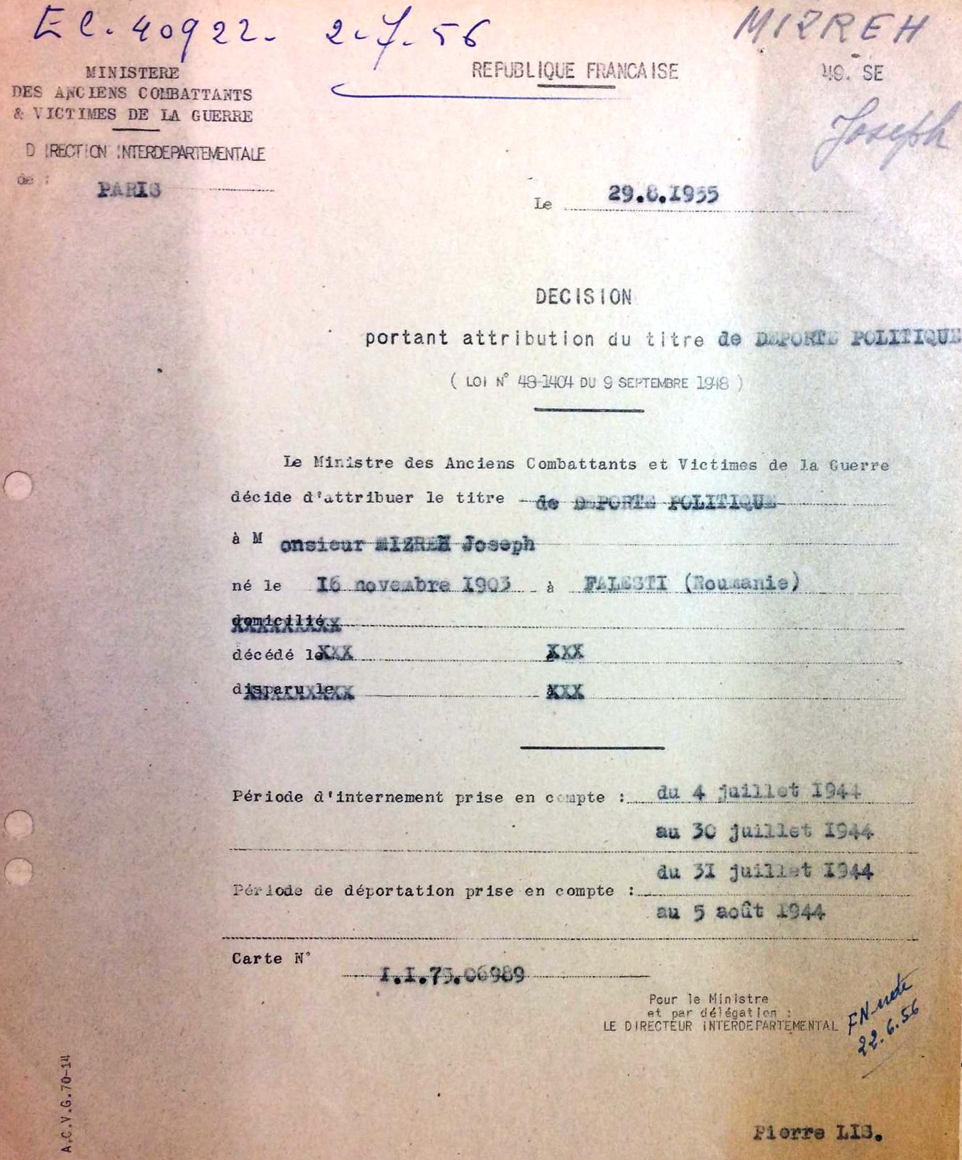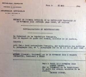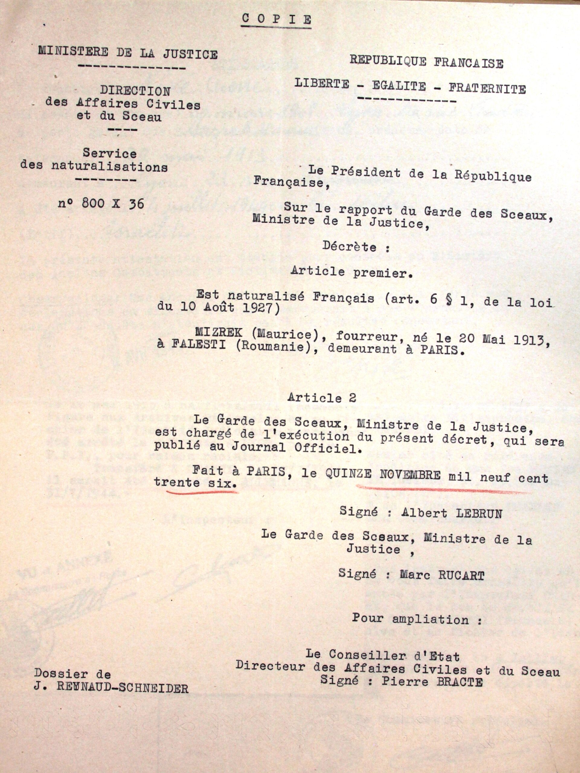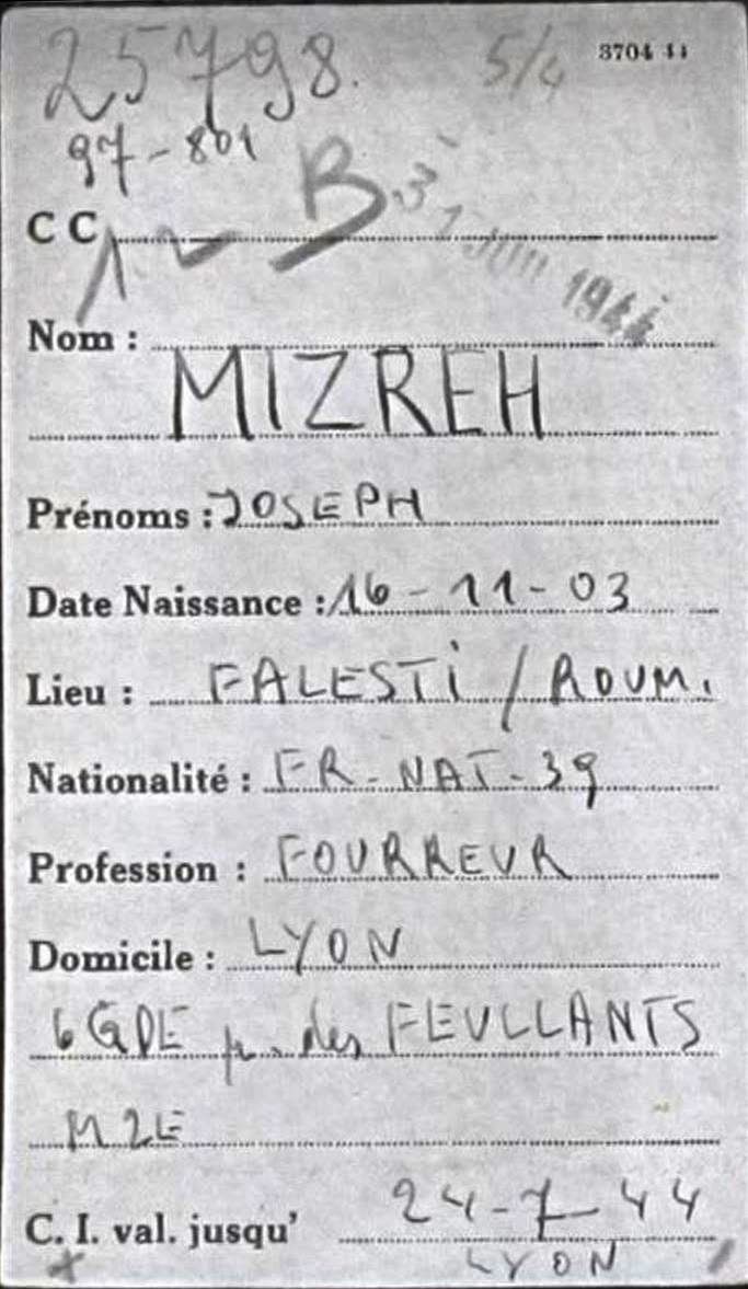Par décret du 9 novembre 1939, à l’âge de 26 ans, Joseph Mizreh est naturalisé français[18].