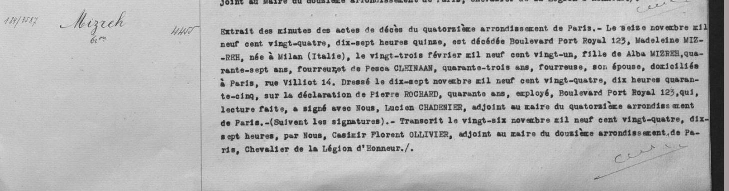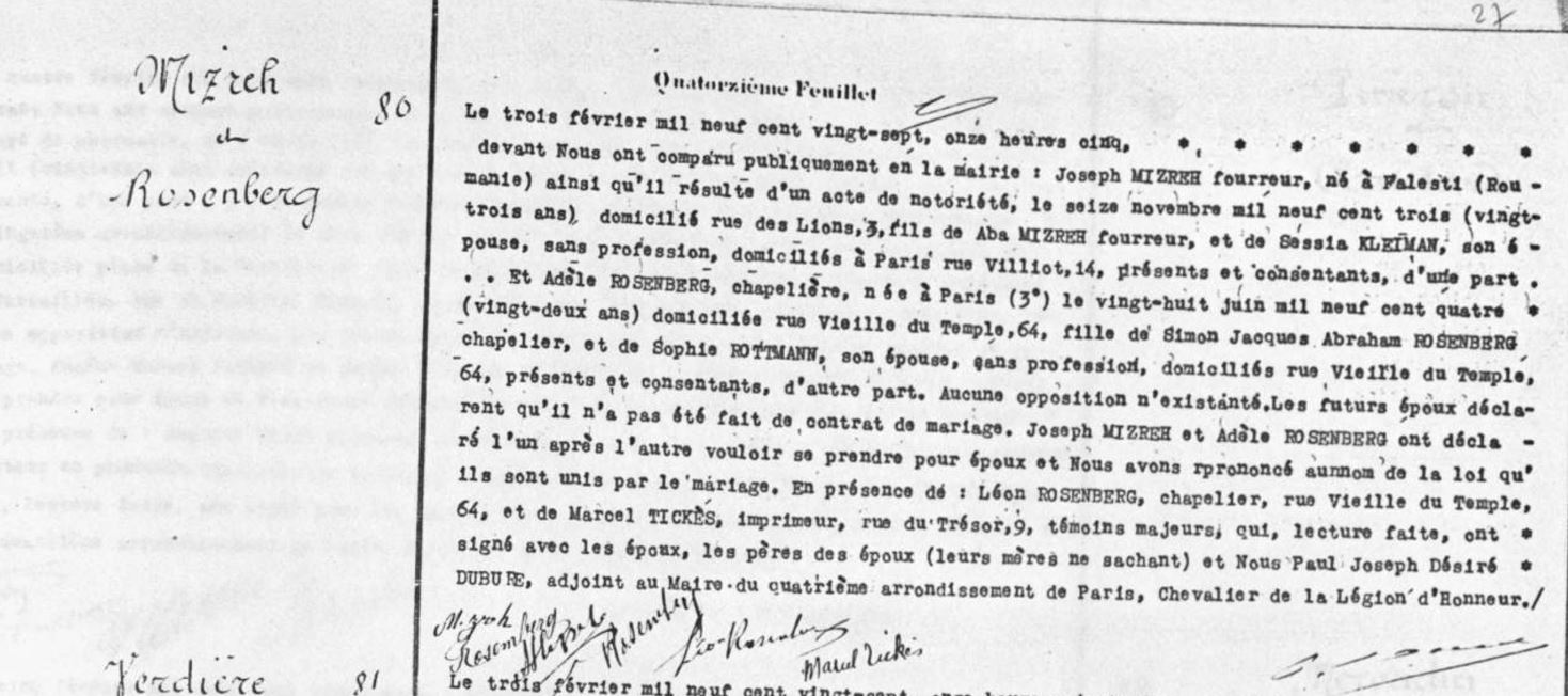 Son épouse, Adèle Rosenberg, est née à Paris (3e) le 28 juin 1904. Elle est la fille de Simon et de Sophie Rottmann. Si les Mizreh sont tous fourreurs, les Rosenberg[15] sont tous chapeliers. Ils habitent à cette époque au 64, rue Vieille du Temple (4e). Le frère d’Adèle, Léon, est témoin au mariage. Sur l’acte de décès de Simon Rozenberg, en 1933 à Paris 3e, on apprend qu’il était originaire de Buzău, en Roumanie.
