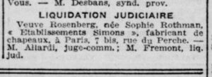 Deux ans plus tard, des entrefilets dans la presse rendent compte de la liquidation des établissements Simons, confection de chapeaux au 7bis, rue du Perche (3e), que tenaient Sophie Rottmann, devenue veuve. Simon et Sophie Rottmann furent inhumés au cimetière parisien de Bagneux[16].