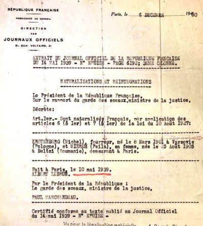 Le JO du 14 mai 1939 annonce la naturalisation de Michel et Peila Krotenberg.