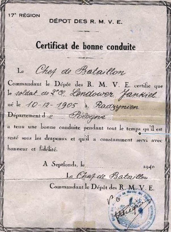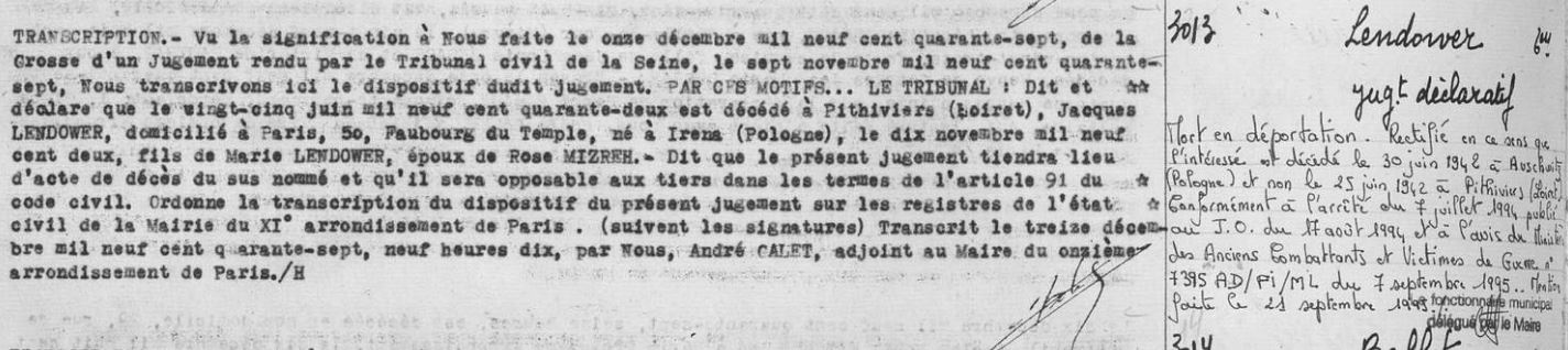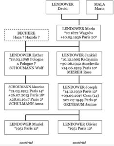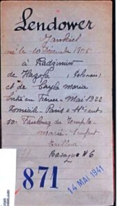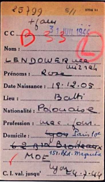 Jankiel Lendower est né le 10 décembre 1905[22] à Radzymin[23] (Pologne). Sur sa fiche de détention à Pithiviers, il est dit qu’il est entré en France en mai 1922. Lors de son mariage, il est dit fils de Maria Lendower. Il habite alors au 123, rue Montmartre (2e) tandis que sa mère réside au 5, impasse de Ménilmontant[24] (11e). Muriel Lendower apporte les informations suivantes : « Marie Lendower était mariée en Pologne avec Haza[25] Bechere. Ce dernier vint en France en premier avec l’idée d’y installer sa famille, mais il s’y maria avec une autre ( !). Maria arriva néanmoins en France mais ne put faire valoir son mariage en Pologne, non reconnu. Elle fut donc déclarée sous son nom de jeune-fille ».