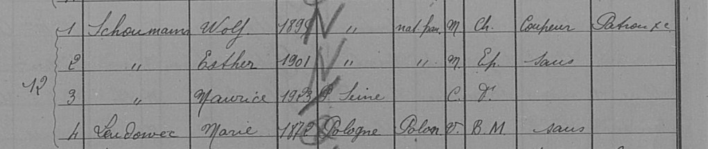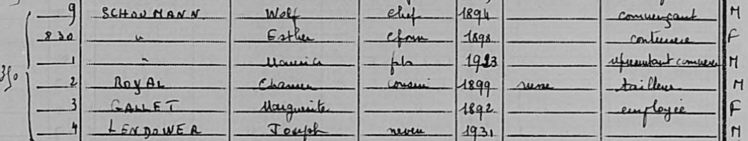 On sait finalement bien peu de choses sur lui, sinon qu’il avait une sœur aînée, Esther, née le 18 mars 1898 en Pologne[26]. Elle épousa, sans doute en Pologne[27], Wolf Schoumann, coupeur en textile polonais. Le Journal Officiel du 13 mai 1928 annonce la naturalisation de Wolf et d’Esther.