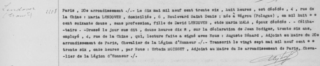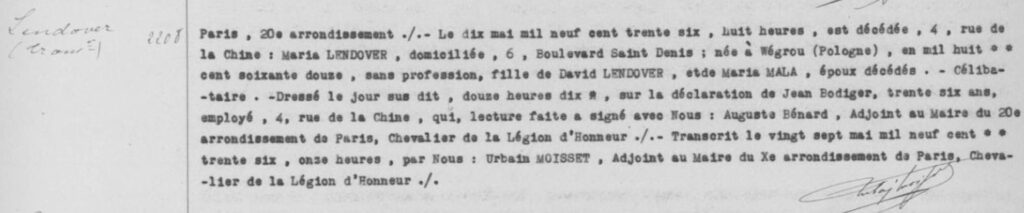 On retrouve enfin l’acte de décès de Maria Lendower, la mère d’Esther et de Jankiel, le 10 mai 1936 à l’hôpital Tenon (20e).