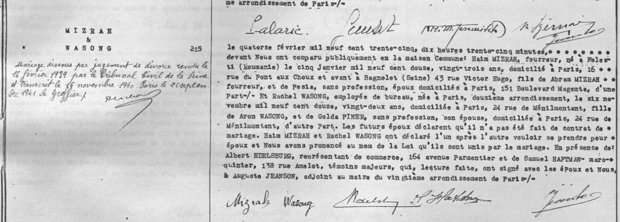 Acte de mariage Haïm Mizrah et Rachel Wasong – 1935 – Paris, 20e