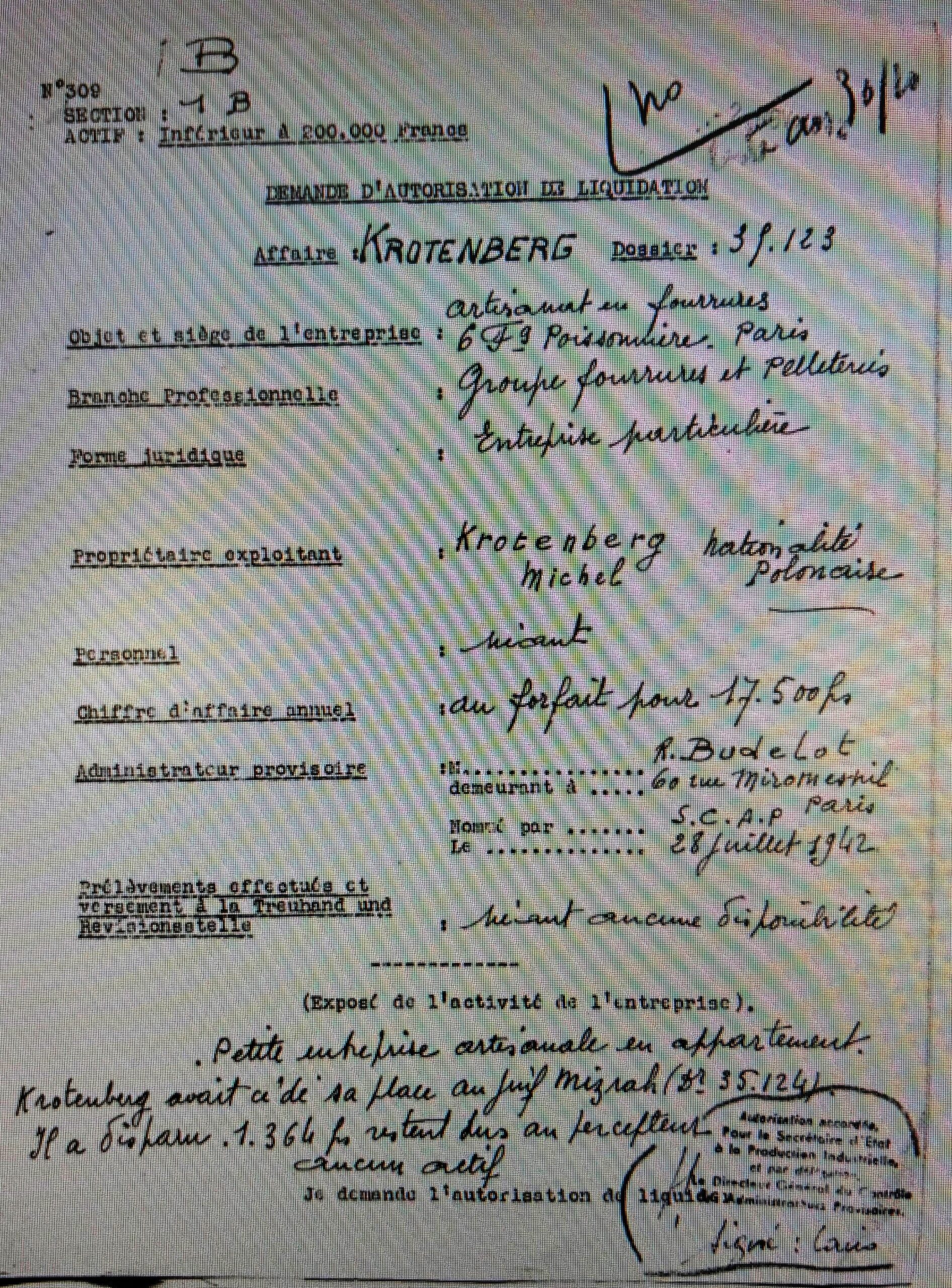 Le Registre du Commerce du 30 octobre 1934 témoigne de la création par Michel Krotenberg d’une entreprise de fourrure portant son nom. A l’origine établie au 28, rue du Petit-Musc (4e), il déménagea par la suite au 6, rue du Faubourg Poissonnière (10e)[20].