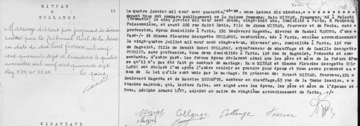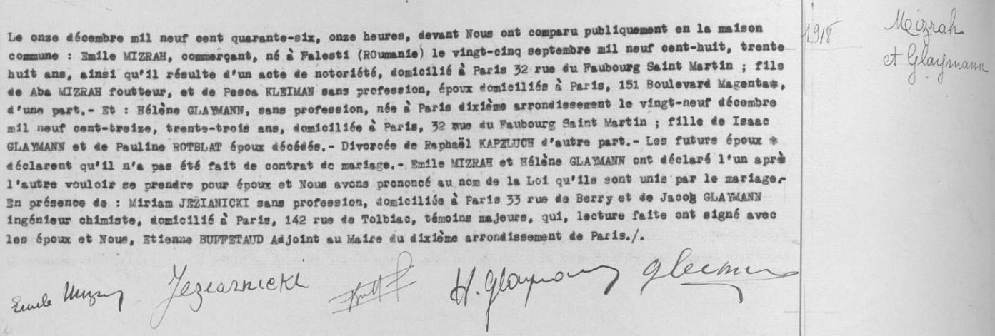 Acte de mariage de Emile Mizrah et Hélène Glaymann – 1946 – Paris 10e – Etat civil V