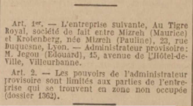 Paulette et son fils Maurice Krotenberg, qui a alors 22 ans, sont restés à Lyon et sont également dans l’attente d’un éventuel retour de Michel. On sait qu’en cette année 1946, ils rétablissent l’inscription de leur boutique, spoliée en 1942, au 23, rue Duquesne.