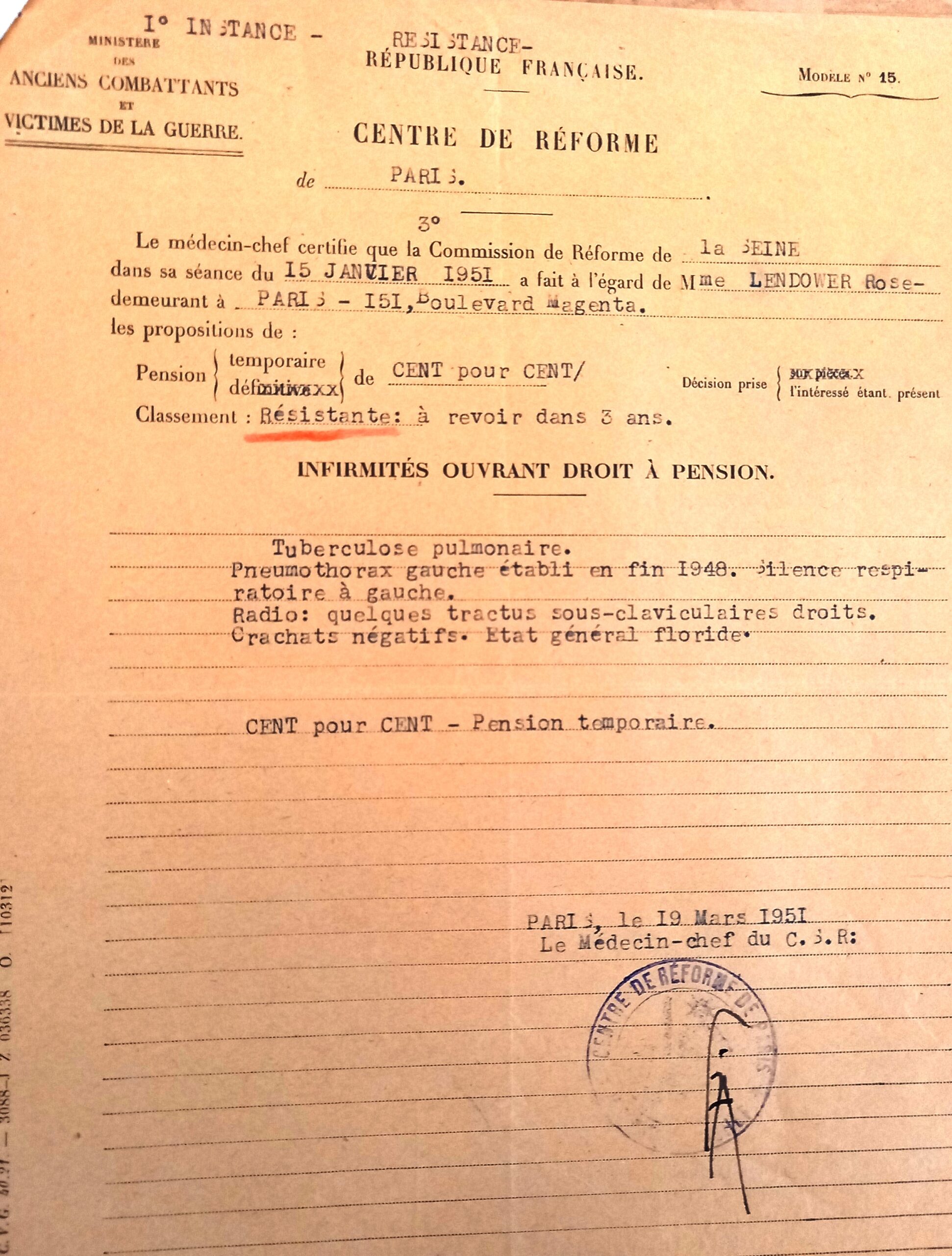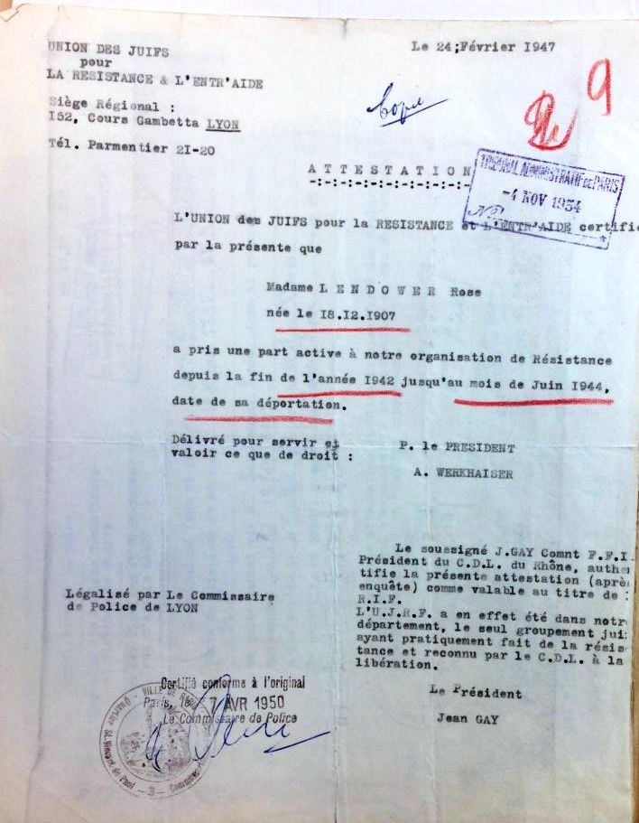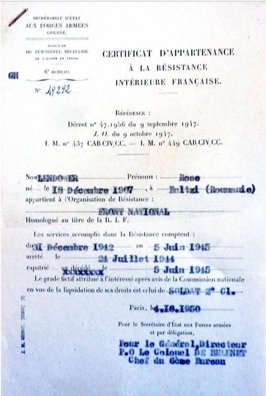 Le cas de Rose fut plus compliqué : en 1949, elle voulut faire valoir son passé de résistante. Elle obtint des certificats confirmant sa participation de la part du Front national et de l’UJRE. Si elle fut bien reconnue, par un arrêté du 18 mai 1951, « soldat de 2nde classe » au titre de la Résistance française, son dossier en vue de l’attribution du statut de « déporté résistante » fut refusé en 1953 par le Ministère des Anciens Combattants et Victimes de Guerre. Rose fit un pourvoi devant le Tribunal Administratif de Paris qui confirma ce refus en novembre 1955. Les arguments allégués furent les suivants : si l’activité de résistante de Rose ne fut jamais remise en cause, ce sont les causes de son arrestation qui le furent[53]. Si son certificat du Front national établissait son sa participation à la Résistance comme motif de son arrestation, celui de l’UJRE considérait son origine israélite comme la cause. En outre, comme nous l’avons vu, Rose avait, lors de son arrestation, indiquée qu’elle était juive ; peut-être justement pour cacher son activité résistante, qui ne fut peut-être jamais connue par les autorités françaises et allemandes. Le refus fut étayé par le fait que de Drancy à Raguhn, les lieux de détention étaient ceux des populations israélites, et pas résistantes. Les autorités en arrivèrent à la conclusion que c’était bien pour un motif racial qu’elle avait été déportée, et que son statut relevait donc de celui des déportés et internés politiques.