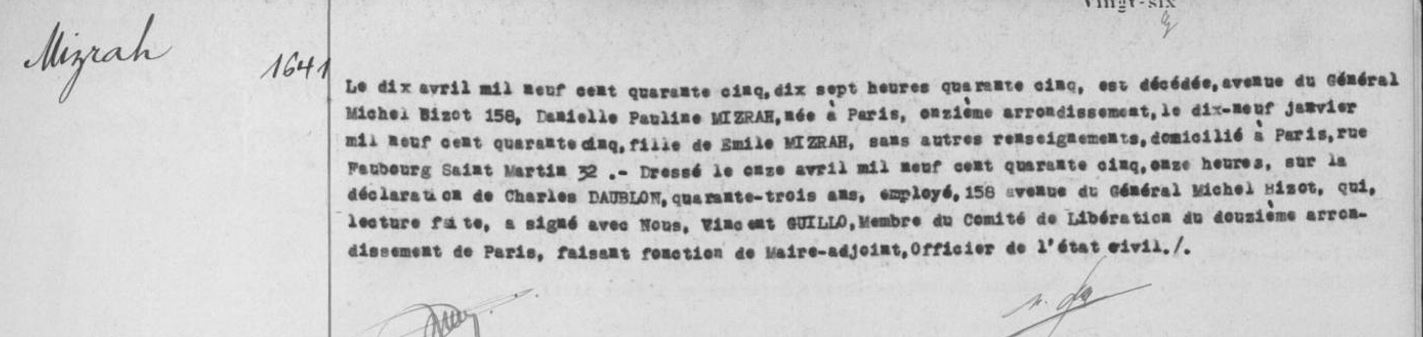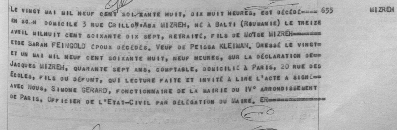 Acte de décès de Aba Mizreh – 1968 – Paris, 4e arrondissement – Etat civil