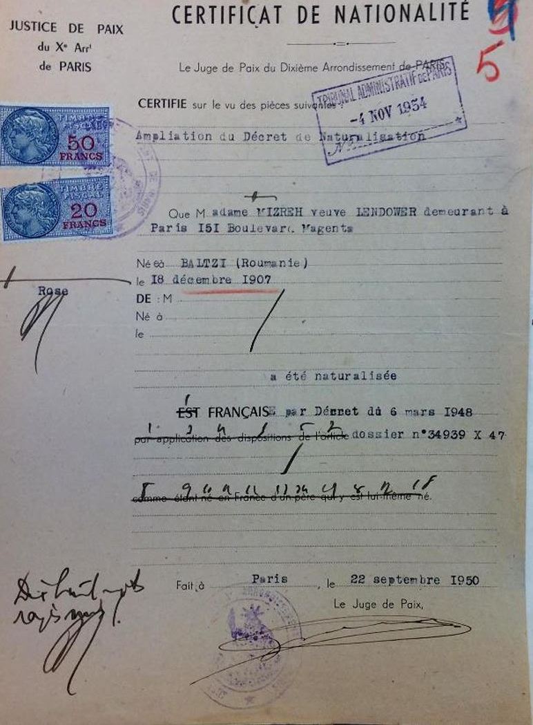 Cette même année 1948, après une procédure lancée dès 1948, Rose fut naturalisée française. A son retour du sanatorium, elle alla habiter au 93, rue Oberkampf à Paris (11e).