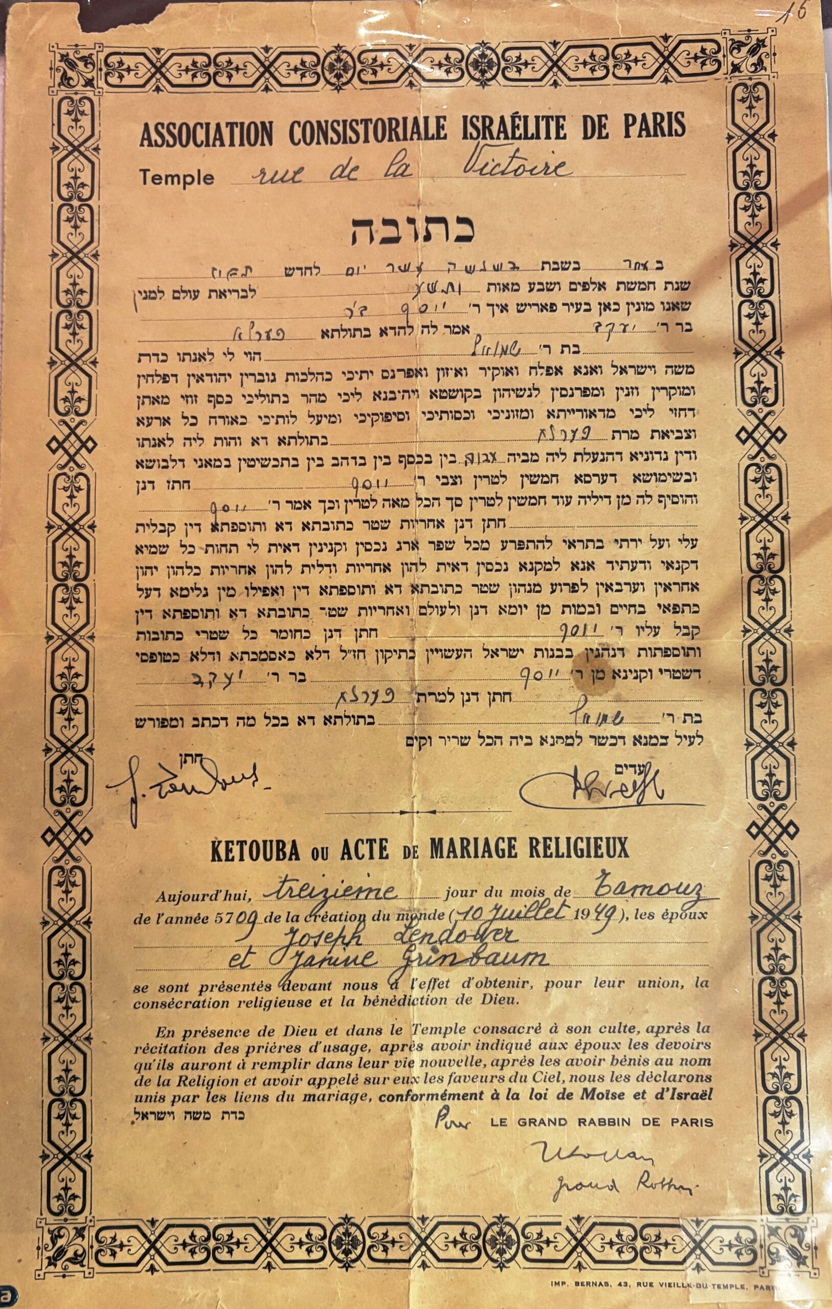 Son jeune fils Georges, âgé de 19 ans, épouse le 07 juillet 1949, dans le 9ème arrondissement de Paris, Janine Grinbaum. Leurs enfants, Rose et Olivier, possède la ketouba de ce mariage.