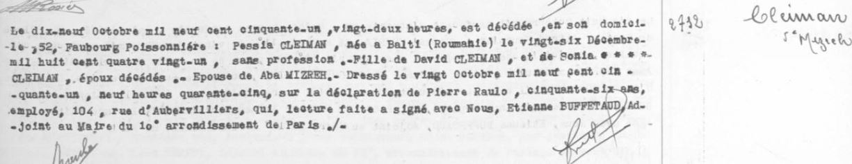 Acte de décès de Peissa Cleiman-Mizreh – 1951 – Paris, 10e arrondissement – Etat civil