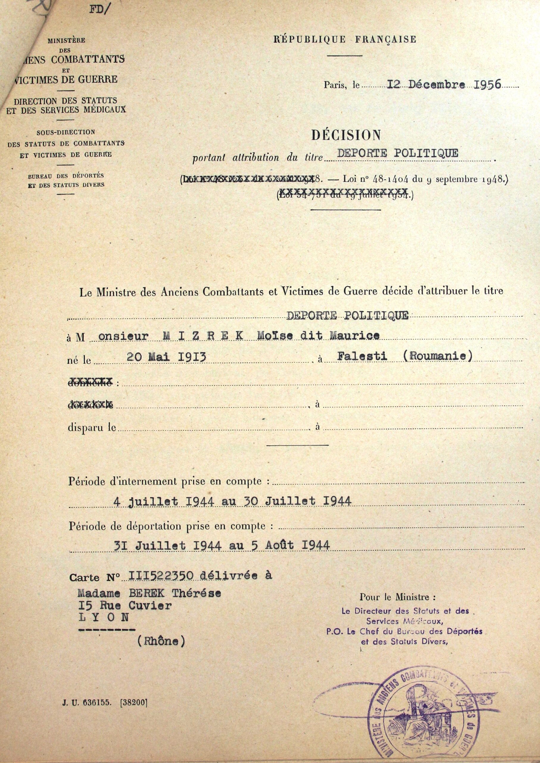 Depuis 1945, la famille Mizreh avait entamé la lente procédure pour savoir ce qu’étaient devenus les siens, abandonnant progressivement l’espoir de les voir revenir. C’est plus de dix ans après la fin de la guerre que les membres de la famille Mizreh se virent attribués le titre de « déporté politique », terme ambigu désignant les Français transférés et internés hors du territoire national pour tout autre motif qu’une infraction de droit commun, c’est-à-dire pour des motifs raciaux. Michel (Menachem) Krotenberg, Joseph Mizreh et Maurice Mizrek reçurent officiellement ce titre entre 1955 et 1956. En 1956, Peila et Adèle reçurent un « pécule aux ayants-cause » de 12 000 frs.