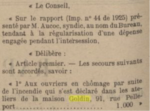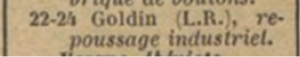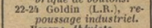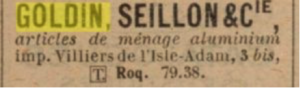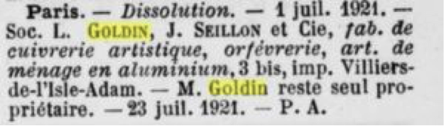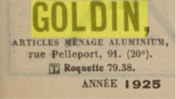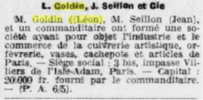 Le 1er janvier 1925, Léon Goldin apparaît dans l’Annuaire industriel (répertoire analytique général de l’industrie suivant la classification) de M.M Pernet, Gensel et Thirion. Son entreprise se situe 91 rue Pelleport dans le 20e arrondissement. On la retrouve dans la rubrique 307 « Bronzes et objets d’art, partie 307-2 Cuivrerie d’art, section cache-pots, jardinières en cuivre repoussé et dans la rubrique 308 Articles de ménage et de cuisine, section articles de ménage en aluminium ».