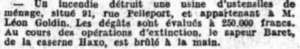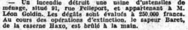 Malheureusement pour Léon, peu de temps après, son usine est détruite par un incendie. Ce fait divers est relaté par le journal Le Matin du 11 janvier 1925, qui informe les lecteurs que les dégâts sont estimés à 250.000 francs. Le conseil municipal de Paris accorde à ses ouvriers qui se retrouvent au chômage à cause de l’incendie une aide de 1.000 francs.