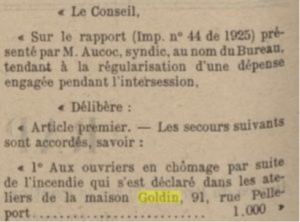 [14]L’adresse est indiquée notamment dans l’acte de mariage de la fille de Louise, Gabrielle Lucienne Daffos. Elle s’est mariée le 3 décembre 1929 à la mairie du 20e arrondissement avec André Antonin Pain né le 31 mars 1899 à Paris dans le 11e arrondissement, industriel, domicilié à Valence (Drôme), 191 avenue Victor Hugo. Gabrielle était domiciliée 2 rue d’Annam chez sa mère et son beau-père, Léon Goldin. L’adresse de l’entreprise figure dans l’Annuaire du commerce Didot-Bottin daté du 1er janvier 1930.