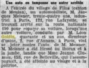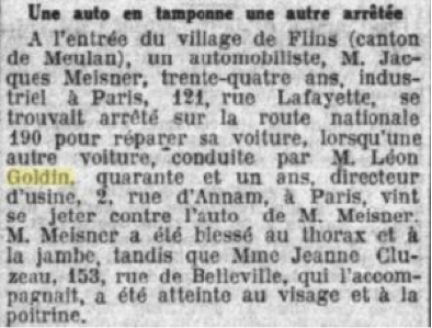 Le niveau de vie de Léon est suffisamment élevé pour lui permettre d’avoir une automobile, ce qui est encore assez rare avant la Seconde Guerre mondiale. Et, c’est avec cette voiture, en 1928, que Léon Goldin a un accident. Son nom apparaît dans la rubrique des faits divers du Petit Parisien du 23 février 1928. À l’entrée du village de Flins, Léon a tamponné la voiture de Jacques Meismer 34 ans industriel à Paris, arrêté sur la route départementale 190 pour la réparer. M. Meismer a été blessé au thorax et à la jambe, Mme Jeanne Cluzeau, sa passagère a été atteinte au visage et à la poitrine. Léon Goldin, 41 ans, est mentionné comme directeur d’usine, habitant 2 rue d’Annam à Paris 20e arrondissement.