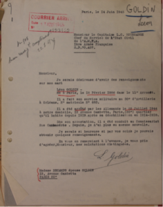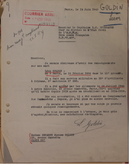 Ce que nous savons de l’arrestation de Léon Goldin provient du dossier que son épouse a déposé après la guerre pour faire reconnaître son statut de déporté. Dans celui-ci se trouvent divers documents, dont un courrier envoyé par sa femme et sa belle-fille, Gabrielle Lucienne Daffos[16], auprès du ministère des Anciens Combattants et Victimes de la Guerre pour obtenir des informations sur son sort. Elles indiquent sa taille, qu’il est « industriel », et soulignent qu’il a les cheveux blancs.
