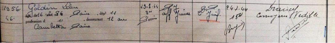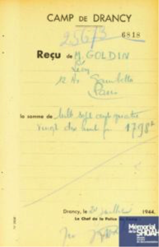 Nous n’avons pas d’information sur la manière dont Léon Goldin a été directement touché par les mesures antisémites des lois sur le statut des Juifs du régime de Vichy et des mesures prises par l’occupant allemand après l’armistice de juin 1940. Son entreprise a-t-elle été aryanisée après la loi du 22 juillet 1941 ? Comment (sur)vit-il ? S’est-il fait recenser comme juif au commissariat de son quartier en octobre 1940, ainsi que le font 90% des Juifs de la région parisienne ? Portait-il l’étoile juive obligatoire ?