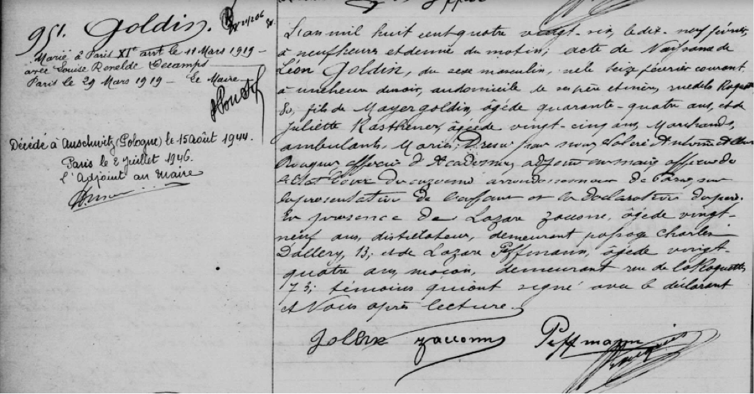 La première trace de la famille Goldin à Paris correspond à l’acte de naissance de Léon, le 16 février 1886, enregistré à la mairie du 11e arrondissement.