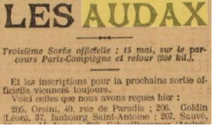 [12] Le participant devait retirer son brassard à l’Auto contre un droit d’entrée de 3 francs. En cas d’échec, le candidat est remboursé de 2 francs 75. Si réussite, le nouveau Audax recevait l’insigne en argent (Aigle d’argent 200) numéroté et un diplôme constatant sa performance. Audax veut dire audacieux en latin. Ce club parisien est un club cyclotouriste fondé en 1904 dans lequel les cyclotouristes devaient parcourir les 200 km à une moyenne de 18km/h. L’Audax est une épreuve de régularité et d’endurance, à allure imposée conduite par des capitaines de route. Le premier brevet de 200km cycliste a eu lieu le 3 avril 1904.