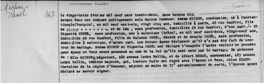 Ils ont pour témoins de mariage Élie Michon (un parent d’Avram ?) négociant, résidant 162 avenue Ledru-Rollin, Paris 11e, et Albert Béhar, cordonnier turc, 163 avenue Ledru-Rollin, Paris 11e, à deux pas de la rue Basfroi.