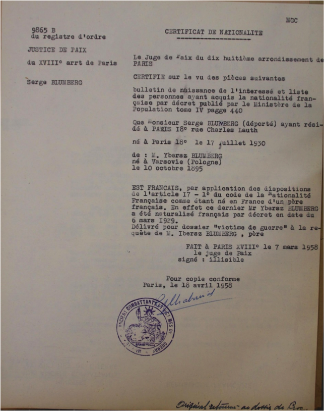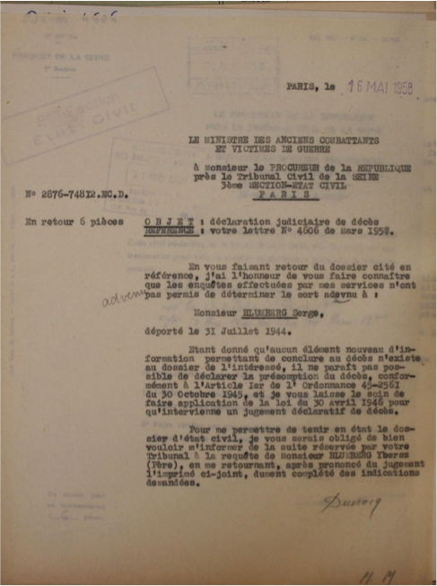 Finalement, Armand obtient une décision judiciaire de décès de Serge, le 16 mai 1958, quatorze ans après son extermination. Comme il est né en France, il obtiendra la mention « Mort pour la France », le 24 novembre 1958, qui sera reportée sur son acte de décès, à la mairie du XVIIIe arrondissement.